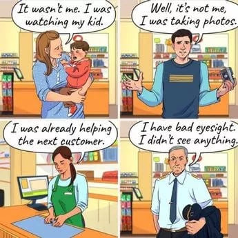 Alles, was Sie tun müssen, ist, sich das Bild unten anzusehen und zu erkennen, welche der Personen im Laden jemandem die Brieftasche gestohlen hat. Drei der abgebildeten Personen sagen die Wahrheit, aber eine von ihnen lügt.