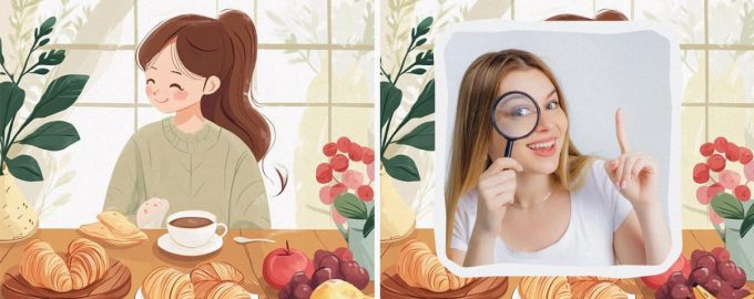 Die Bilder zeigen ein süßes Mädchen, das in ihrer Küche frühstückt. Sie trinkt Kaffee (oder Tee) mit leckeren Croissants. Und zum Nachtisch erwartet man sie mit Früchten. Die Bilder sehen fast identisch aus, mit vier kleinen Unterschieden zwischen ihnen. Werden Sie sie finden können?