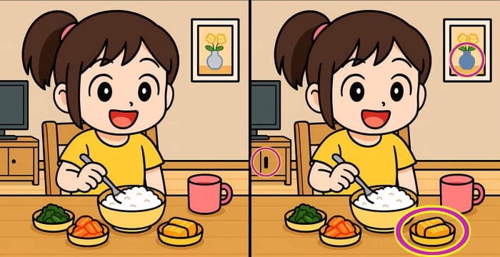 Sind Sie also bereit für die Aufgabe? Schauen Sie sich die beiden Bilder des Mädchens am Esstisch genau an. Auf den ersten Blick mögen sie identisch aussehen, aber es gibt 3 kleine Unterschiede. Glaubst du, dass du sie alle in 49 Sekunden finden kannst? Probieren Sie es aus und testen Sie Ihre Sehschärfe!