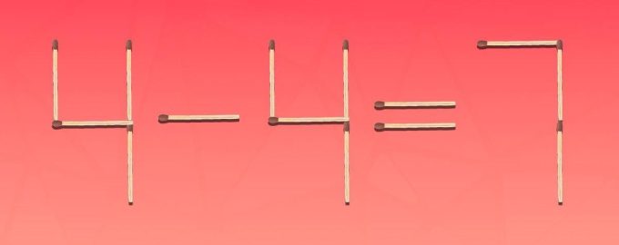 Unten sehen Sie ein Bild, auf dem die Gleichheit 4-4=7 mit Hilfe von Streichhölzern dargestellt ist. Offensichtlich liegt hier ein Fehler vor, denn die Antwort sollte 0 sein.