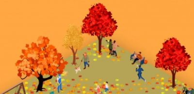 Das Bild zeigt einen herbstlichen Spielplatz, auf dem Menschen und Kinder herumlaufen. Jeder ist mit seinen eigenen Dingen beschäftigt, aber neben einigen von ihnen stehen die Kürbisse, die wir suchen.