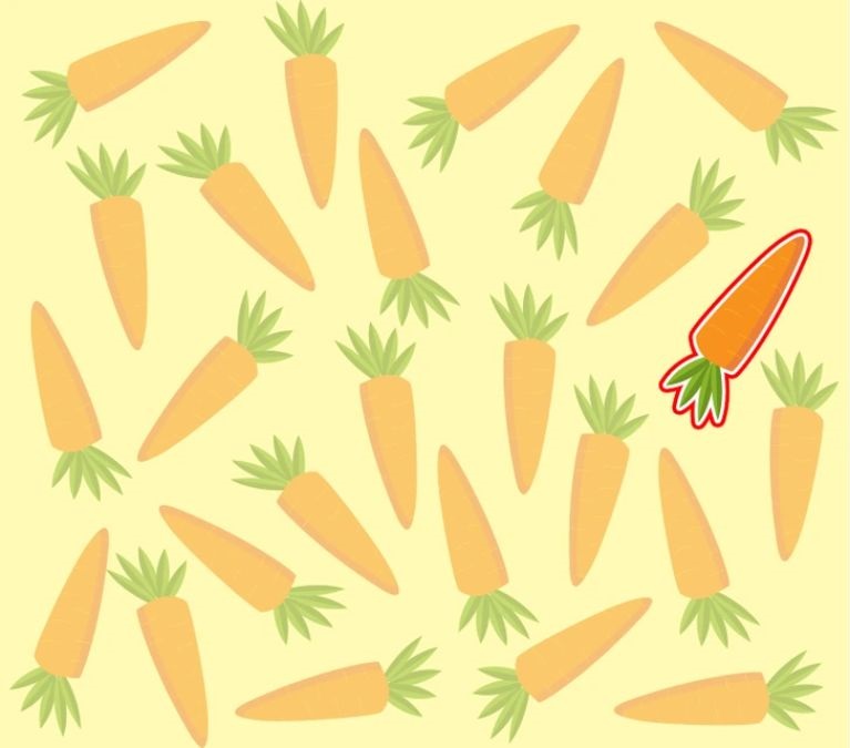 Nur wenige Menschen werden das Rätsel so schnell lösen können. Aber wenn du dich anstrengst und deine ganze Aufmerksamkeit auf das Bild richtest, wirst du auf jeden Fall herausfinden, welche Karotte anders ist als die anderen.